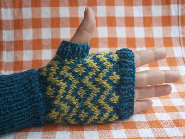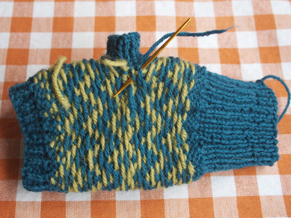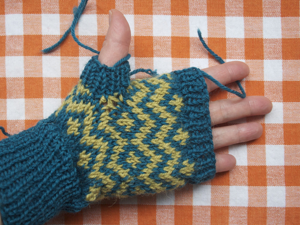 Above Ta Da! No Holes. Now these babies need some serious blocking. Look at that bloated ribbing. Heavens! I’ll wash them lukewarm water with a mild soap, rinse in water of the same temperature, gently press the moisture out, shape my mitts into right and left hand, then dry flat.