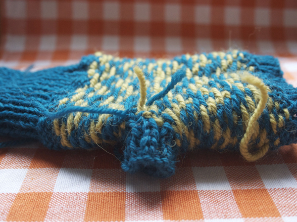 Above Then turn inside out and using the existing ends if they are long enough, begin to sew. These ends are, typically for me, short. You should try and leave longer tails to give your something to work with. If you can’t work with too tiny tails, use a strand of your Main Color yarn about 8-12 inches long.