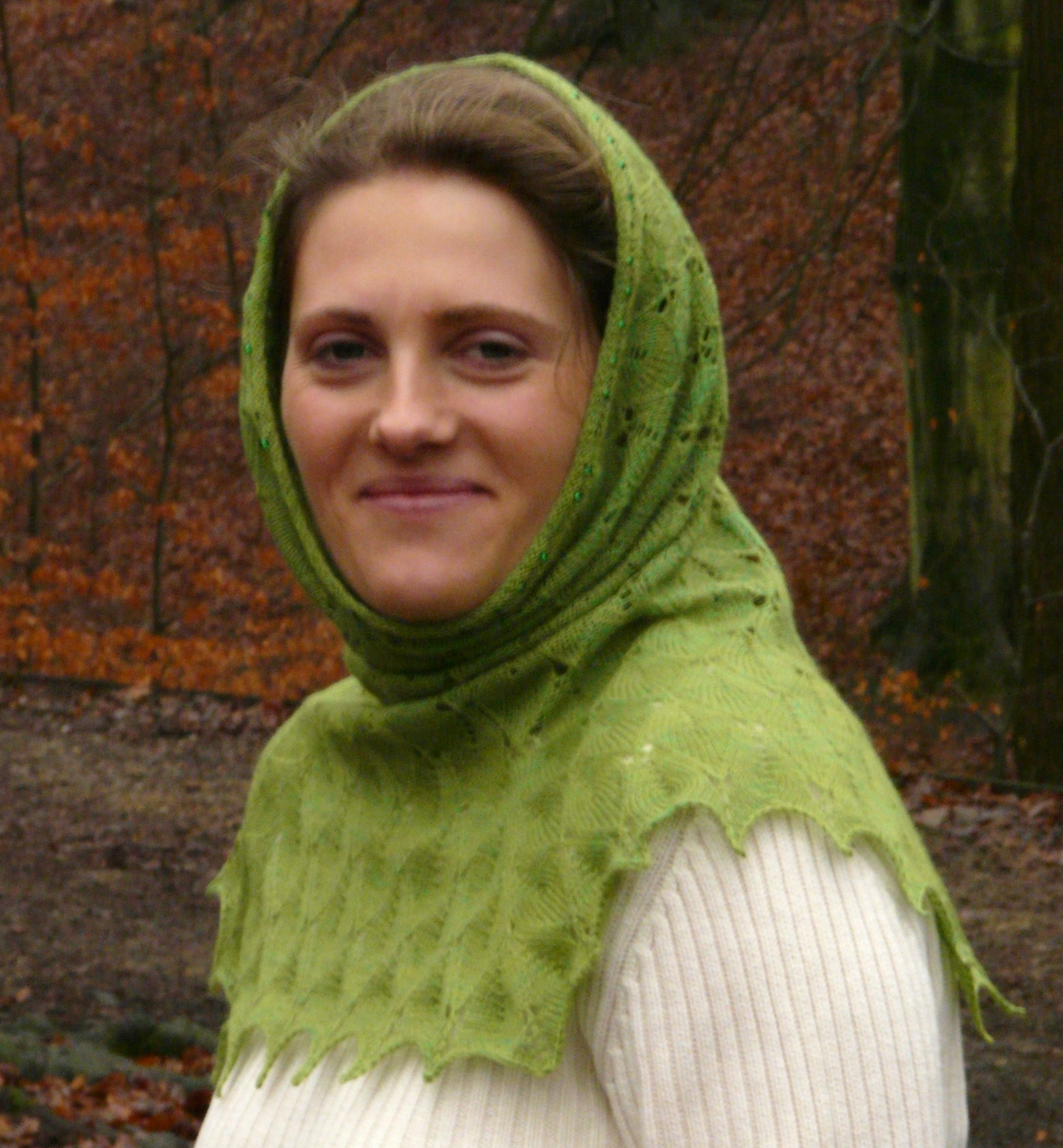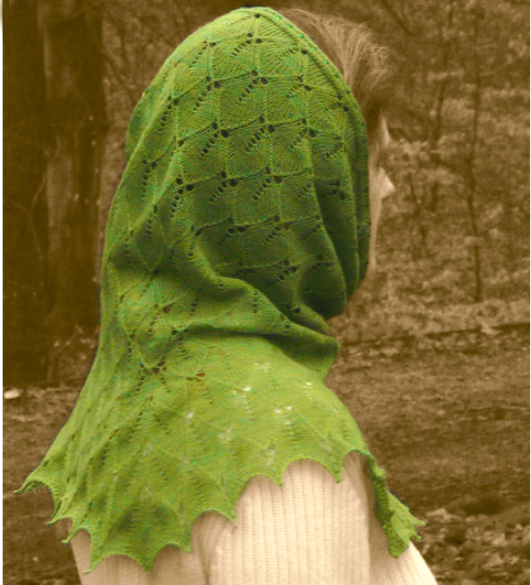 What I really want for myself from Novel Knits is your Lady of the Wood Wimple, which harks back to a much earlier fashion item! I love how it can be worn with the point in front, or my favorite, the somewhat unusual squared shoulder.