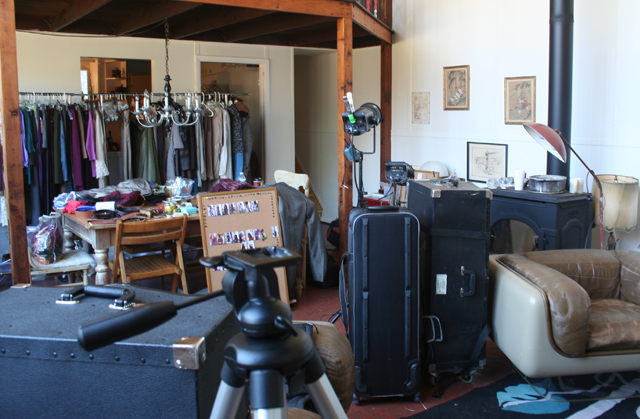 Camera gear, racks of clothes, a table full of accessories…ordered chaos. Norah and I will spend the evening before selecting wardrobe for each piece we intend to shoot the following day. That means all garments and accessories. We group them together in the order we imagine we’ll shoot them. Next day when the models arrive, we’ll try things on as we go and alter our choices if need be. When we shoot on location like this, my job also requires me to be like the Girl With the Pearl Earring, I memorize the space before we go in so I can put things back just the way they were.