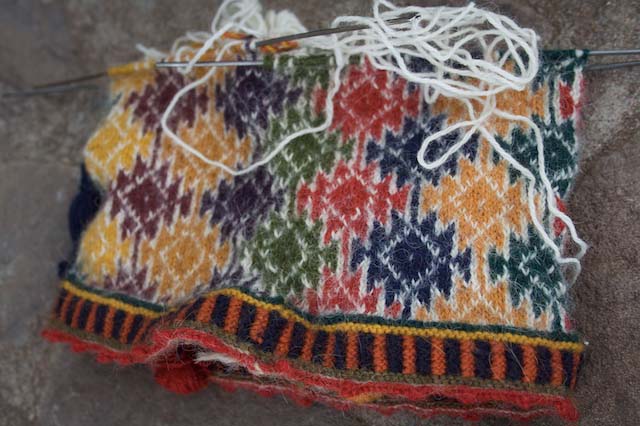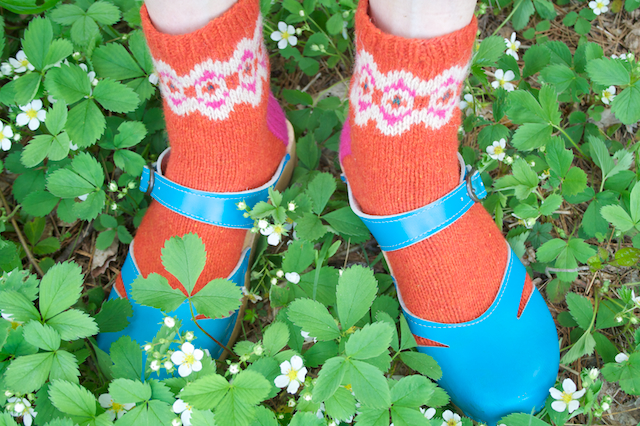 Sun! The first in weeks. Sunny, but still not warm, so Wee Fair Isle socks are just the ticket, not too tall, but enough to keep the draft off your ankles. I especially like wearing clogs with these, because then you can see the sassy Schiaparelli pink heels. I’ve used Harrisville Shetland, which comes in a great selection of colors. I’ve done something not quite according to the fair isle “rules” … can you spot what it is? I’m all for breaking rules when it doesn’t hurt anyone.